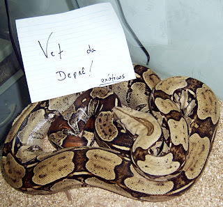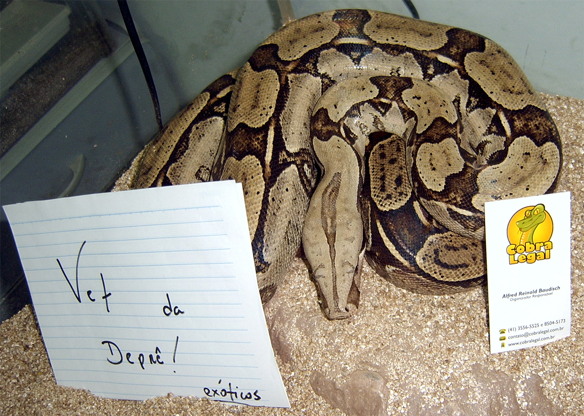 É com prazer que lhes apresento a Jibóia de 1,8 metros chamada Bernardete. Ela tem 3 anos e seu dono se chama Alfred Baudisch, que por sua vez é dono do Cobra Legal.