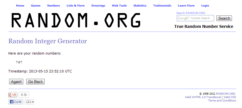 O número de inscrição sorteado pela plataforma Random.org foi o número 767, como podem ver no screenshot: